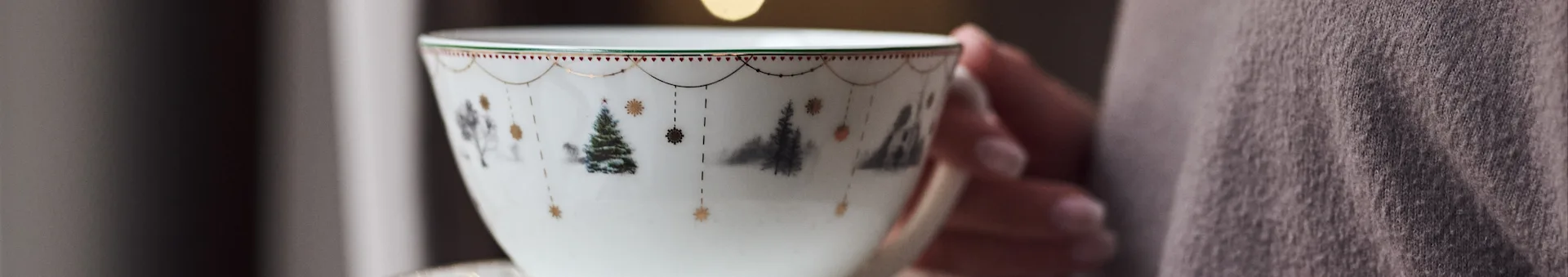 En varm kopp med nytraktet kaffe eller te, servert i en fin kopp med julemotiv er et perfekt tilbehør til julefrokosten, og er også noe du stolt kan servere gjestene dine julekaffe i.
