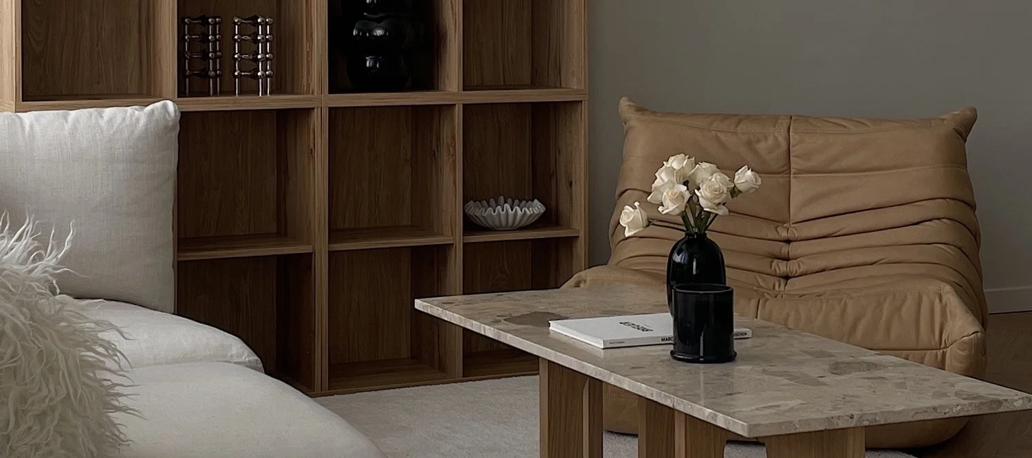 Koselig interiørdetaljer som en vase er perfekt for å skape en koselig stue. Her har influenceren @helenas.hem innredet stuen med Verso-vasen fra Ferm Living.