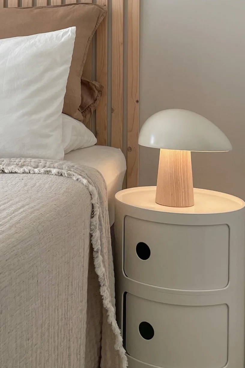 Nå som du har det grunnleggende for å lage ditt eget soverom i skandinavisk stil gjelder det å velge ut det viktigste. Damira sier at hun ønsket å skape en varm og koselig atmosfære på soverommet sitt i skandinavisk stil der varme og nøytrale toner er i fokus. Hun brukte dempet belysning i form av bordlampen Night Owl, duftlys og duftpinner fra Skandinavisk, og ferske blomster i den fantastiske vasen Balloon fra Louise Roe Copenhagen som prikken over i-en.