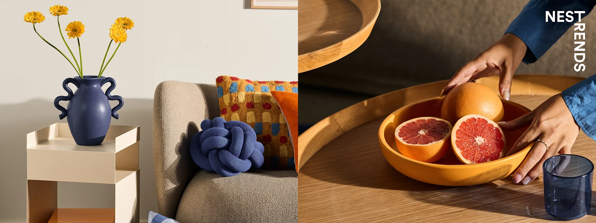 Denne trenden omfavner mange ulike materialvalg som glass, ull, fløyel, denim og bomull. La deg inspirere og få inn trenden ved hjelp av vaser, lysestaker, puter, pledd, eller hvorfor ikke satse på et fargerikt møbel som en ekte statement piece i hjemmet ditt?