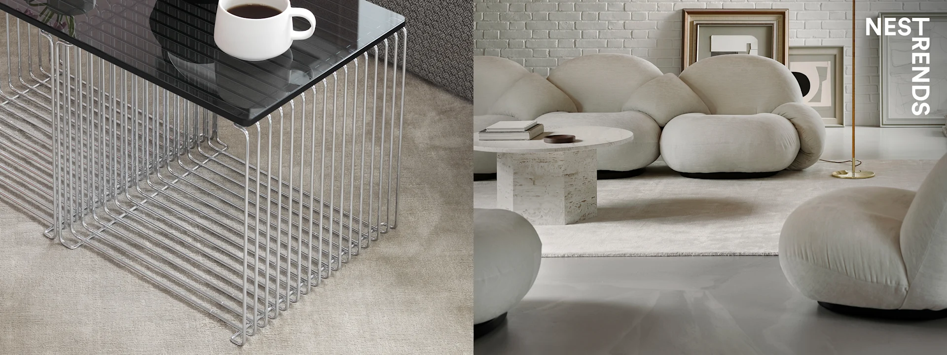 Drømmende detaljer med overdrevne kurver, sterkt reflekterende krom og lekne sjakkbrettmønstre gir de nøytrale fargene et løft og bringer trenden helt inn i nåtiden. Nøytrale toner av beige, offwhite, taupe og brunt danner grunnlaget for kontrasterende svarte og hvite sjakkbrettmønstre og beroligende innslag av fersken og til og med koboltblått.