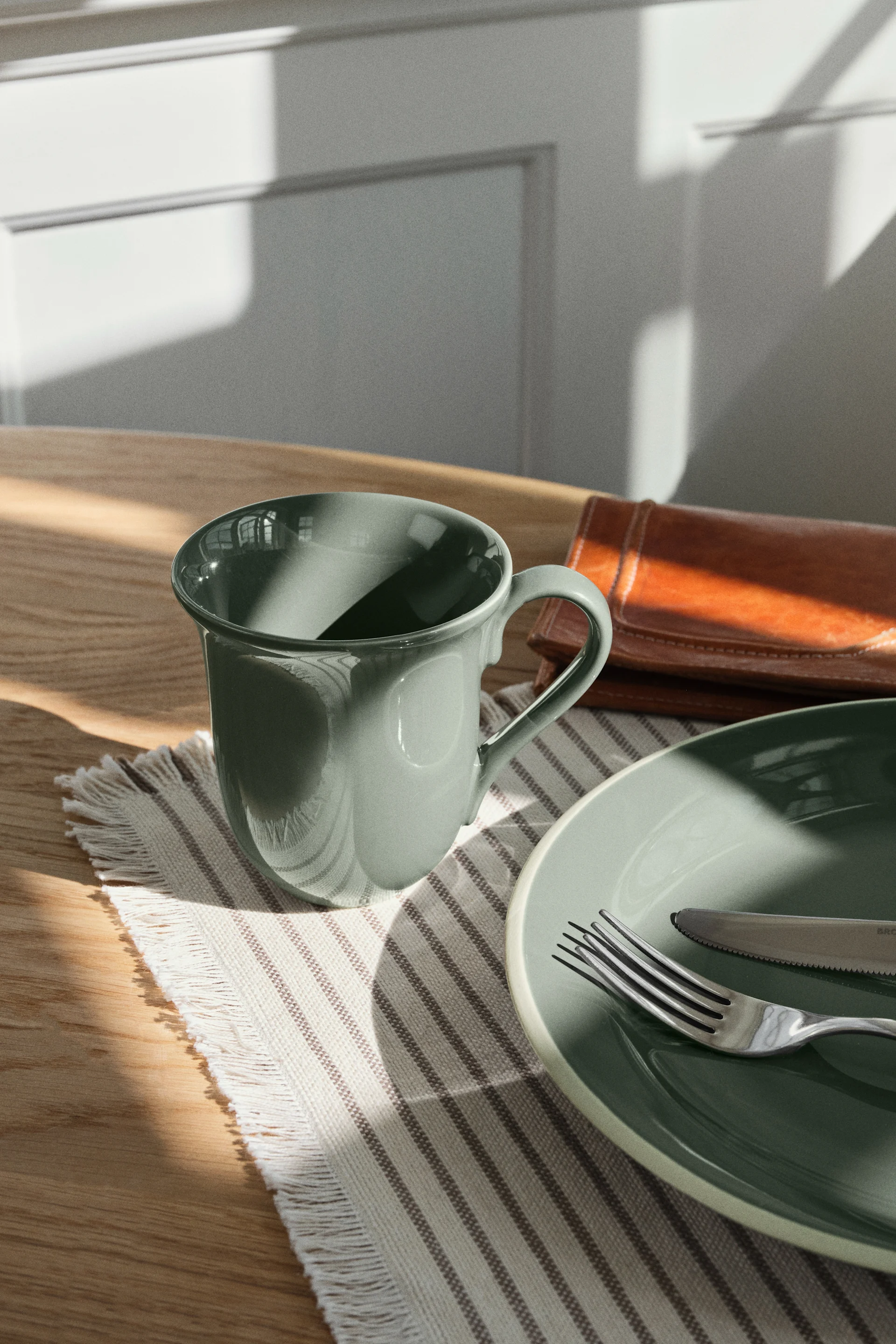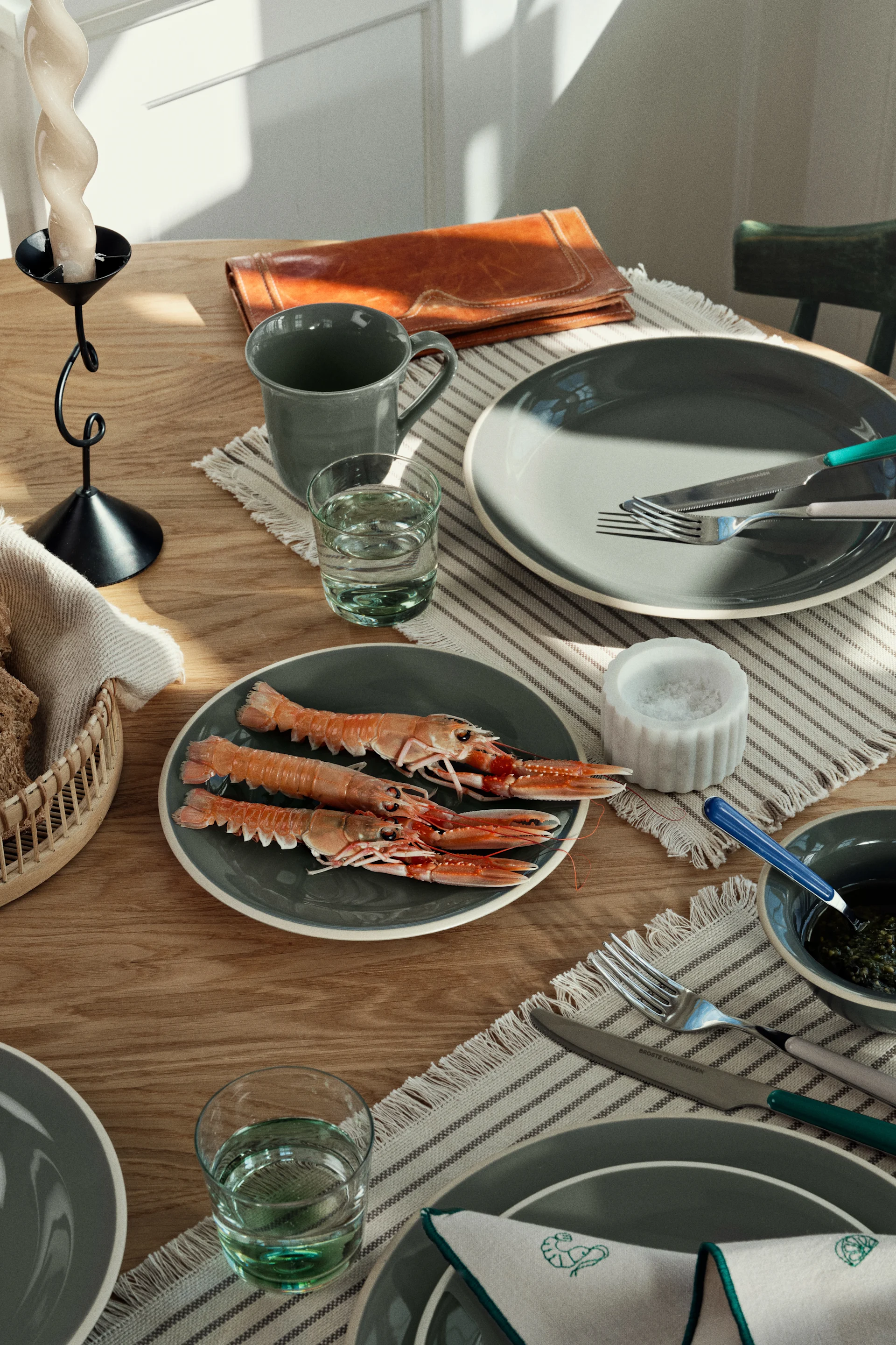 Med servise i denne herlige grønnfargen får du en festlig borddekking med en herlig grønnfarge og en fin innramming. Her er en borddekking i en dempet grønnfarge med høyglanset servise som passer like godt til hverdag som til fest. Skap kontrast med mønstrede servietter, bestikk med fargede håndtak og enkle glass for en uformell og avslappet festdekking. La ulike deler av serviset stå i sentrum på bordet for en litt mer uperfekt følelse og bistro-look.