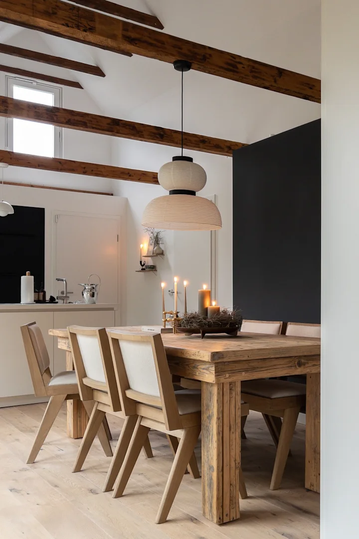 På kjøkkenet ønsker du å investere i funksjonell belysning og stemningsbelysning. Som vi nevnte tidligere, bør du i hovedsak ha et funksjonelt, retningsbestemt lys ved arbeidsflaten på kjøkkenet, men når det kommer til spiseplassen kan du ha mer stemningsbelysning. Det viktigste er at lyset over spisebordet rettes nedover ved hjelp av en åpen skjerm og at lampen ikke henger for høyt opp slik at den blender deg når du sitter ved spisebordet.