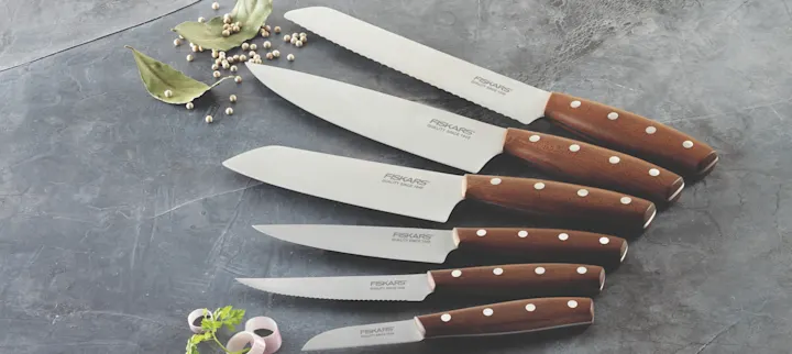 Norden kokkekniv fra Fiskars med elegant treskaft.