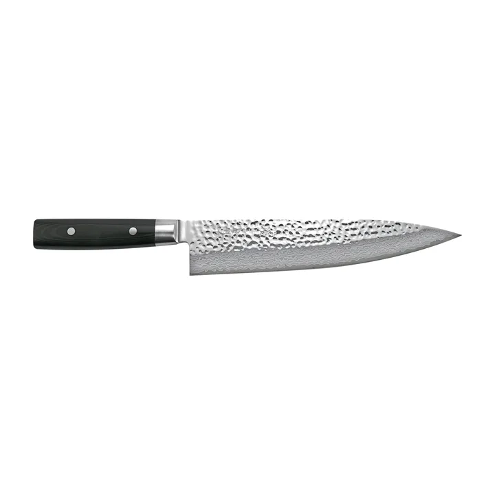 Den lett buede kurven på bladet gjør det lett å både hakke og skjære ingredienser raskt, og de brede bladet gjør det også lett å kutte store og harde ingredienser, som poteter, gulrøtter og gresskar.
