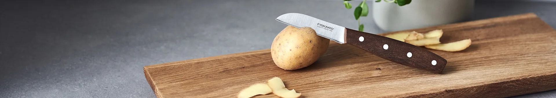 Den klassiske skrellekniven har et spisst blad, og kan brukes til de fleste frukt og grønnsaker.