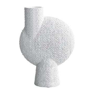 Sphere vase Bubl Shisen big 44 cm fra 101 Copenhagen er et skulpturelt objekt der håndverk, tradisjon og form møtes i en perfekt avveid balanse. Den avrundede silhuetten med sin forhøyede hals bærer en overflate av hundrevis av små sirkler som gradvis går over i et taktilt mønster – en levende struktur som fanger lys og skygge i stadig bevegelse. Som en del av 101 Copenhagens signaturkolleksjon Sphere er vasen utviklet i nært samarbeid med dyktige keramikere for å oppnå den presise kontrasten mellom myke former og tydelige konturer. Inspirasjonen hentes fra antikke kinesiske vaser og japansk estetikk, der ordet Shisen betyr nett eller måten å se verden på. Hvert eksemplar er håndglasert og unikt, med små variasjoner som gir karakter og dybde. Innvendig er vasen lakkert for å tåle vann, men den er ikke helt vanntett – bruk gjerne medfølgende innsats ved friske blomster. Sphere vase Bubl Shisen big 44 cm fra 101 Copenhagen bærer en poetisk enkelhet og skulpturell styrke – et kunstverk i keramikk å leve lenge med.