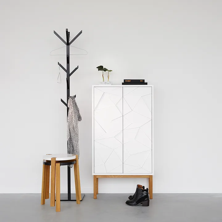 Twig veggknagg fra A2, designet av Sara Larsson, tilbyr en kompakt løsning med fjorten greiner og åtte hakker for å organisere klær. Denne knaggen passer perfekt for små rom som ganger og kontorer, hvor praktisk oppbevaring er viktig.