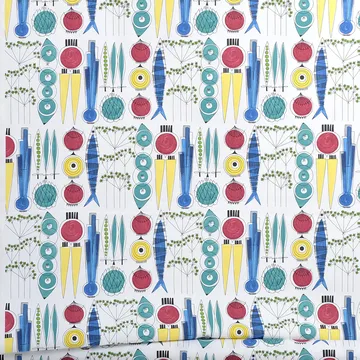 Det herlige stoffet Picknick tilhører femtitallsserien Picknick med kjøkkenprodukter og tekstiler designet av Marianne Westman.