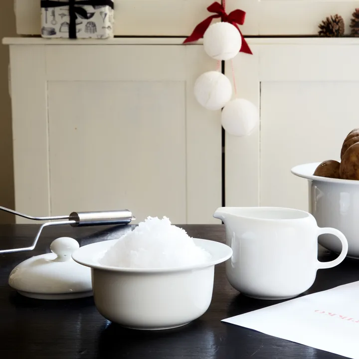Den praktfulle, pene sukkerskålen med lokk fra Arabia inngår i serien Arctica og er i en fin hvit design.
