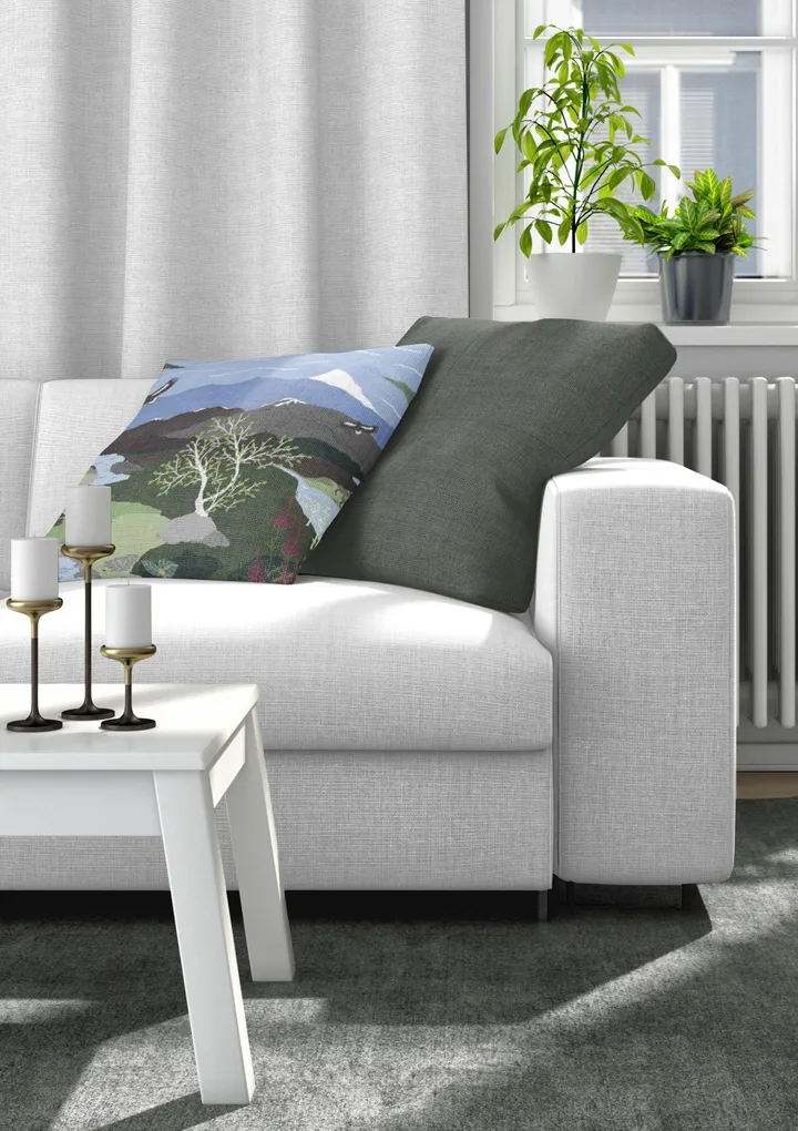 Fjällvandring putetrekk 47x47 cm fra Arvidssons Textil har et nydelig fjellinspirert mønster som er trykt på 100 % bomull. Putetrekket er fint å plassere for eksempel på en krakk i gangen eller i sofaen i stuen. Mønsteret, med blant annet fjell, reinsdyr og blomster, er designet av Louise Videlyck.