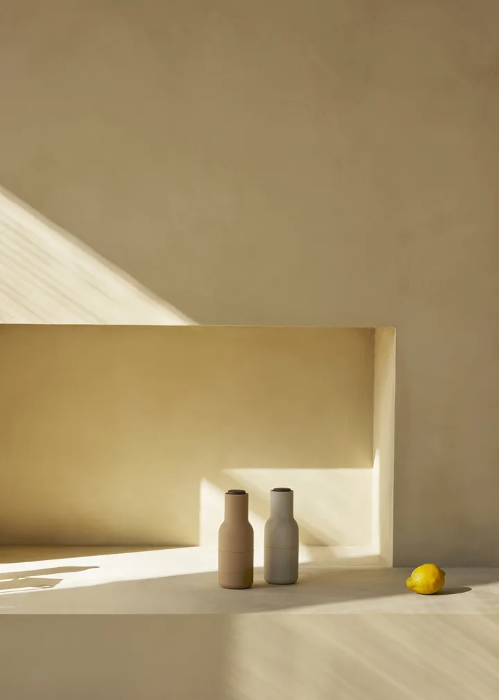 Bottle Grinder salt og pepperkvern fra Audo Copenhagen er en elegant og praktisk kvern med en form som forener funksjon og design i harmonisk balanse. Den flaskformede silhuetten, skapt av Norm Architects, har en myk silikonlignende overflate som ligger behagelig i hånden. Kvernen fylles enkelt på ved å åpne og lukke den på midten, og takket være kvernverket i toppen unngår du søl på kjøkkenbenken. Det kraftige keramiske maleverket håndterer alt fra salt og pepper til frø og tørket frukt, og grovheten justeres smidig med vredet øverst. Bottle Grinder salt og pepperkvern fra Audo Copenhagen er like vakker som funksjonell – et designikon i det moderne kjøkkenet.