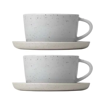 Nyt en varm kopp kaffe i Sablo kaffekopp med fat 2-pakning fra tyske blomus. Kaffekoppen er laget av steingods som har blitt formet under høye temperaturer, noe som gir koppen en høy holdbarhet. Serviset er delvis glasert, og designet minner om vann som flyter over sand, hvilket er det designeren Frederike Martens har hentet inspirasjonen sin fra.