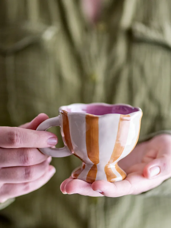 Willa kopp 21,5 cl fra Bloomingville er en stilfull stengodskopp med et håndmalt design og en elegant fot. De bølgete kantene og det stripete mønsteret skaper et unikt utseende med naturlige fargevariasjoner. Perfekt for frokostbordet eller som en dekorativ detalj på kjøkkenet.