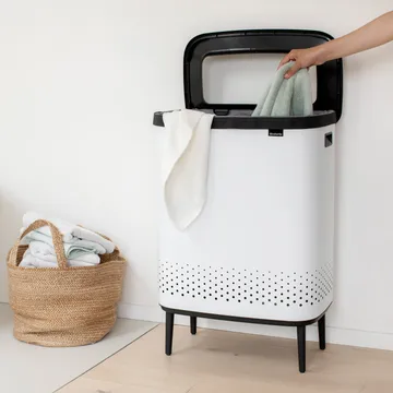 Bo skittentøyskurv high 2x45 L fra Brabantia er en stor skittentøyskurv med ben og to rom for enkel sortering. Åpningen i lokket lar deg raskt kaste mindre mengder tøy oppi kurven, samtidig som den skjuler skittentøyet ditt på en diskré måte. Når du vil legge inn eller ta ut større mengder tøy, er det bare å vippe opp lokket og feste det på siden. Den medfølgende vaskeposen er formet slik at den passer perfekt i kurven, og kan enkelt fjernes ved å løsne på borrelåsen. Skittentøyskurven har smarte ventilasjonshull nederst samt justerbare ben som gjør at den står stabilt selv på ujevne overflater.