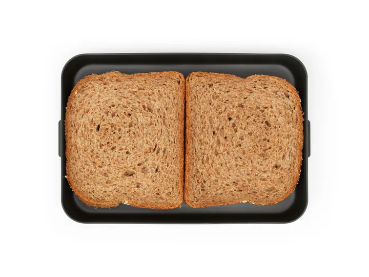 Make & Take matboks flat 1,1 L fra Brabantia er en praktisk og smart løsning for din hverdagslunsj. Den flate formen er utformet for enkelt å få plass i veske eller ryggsekk, og lokket med sikre clips holder innholdet på plass — rommer opptil fire smørbrød. Perfekt for den som ønsker et gjenbrukbart, prisvennlig og sunt alternativ til engangsforpakninger. Lett å rengjøre og enkel å pakke, en pålitelig følgesvenn for jobb, skole eller utflukt.