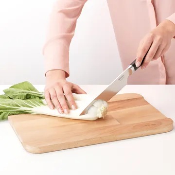 Denne skjærefjølen fra serien Profile fra Brabantia er tilpasset grønnsaker og er laget av tre med avrundede hjørner. Skjær og hakk grønnsaker, frukt og urter på den høye delen og skrap deretter ingrediensene ned til det lavere nivået. Fordi den lave delen er smalere, blir det enklere å skrape alt over i stekepannen eller salatbollen uten å søle. Skjærefjølen kan gjerne også brukes som serveringsbrett.