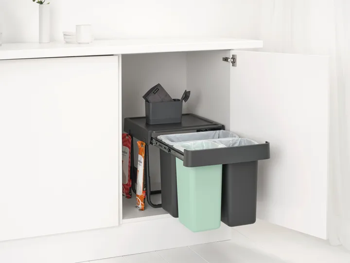 Sort&Go Innebygde bøtter, 10+10+20 L fra Brabantia er laget av stål og resirkulert polypropylen. Disse bøttene er perfekte for avfallssortering og sparer gulvplass ved å passe i skapet. De er enkle å montere, rengjøre og tømme, og har ekstra lagringsplass og kroker for orden.