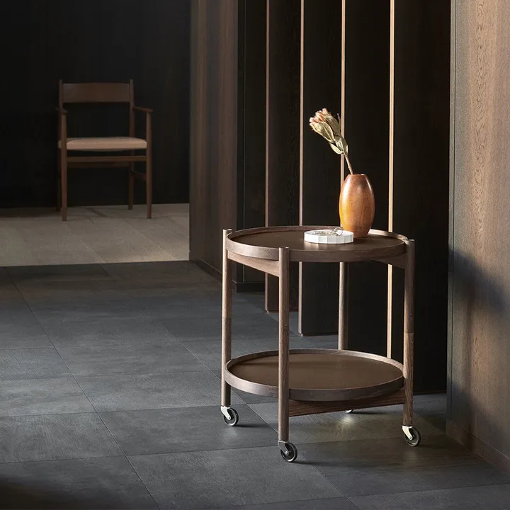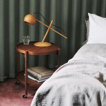 Bølling Tray Table model 50 rullebord fra Brdr. Krüger er et elegant brettbord i massivt tre som forener tidløs design med funksjonell bruk. Skapt av Hans Bølling i 1963, har det blitt en ikon innen dansk designhistorie. Med sine bevegelige hjul og vendbare brett tilbyr bordet en fleksibel løsning for servering, oppbevaring eller som en stilfull detalj i stuen. Den gjennomtenkte konstruksjonen gjør det enkelt å flytte og tilpasse etter behov, enten det brukes til hverdags eller fest.