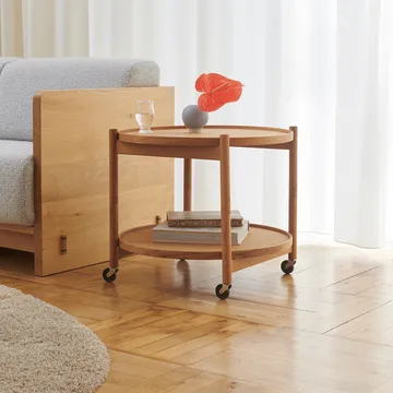Bølling Tray Table model 60 rullebord fra Brdr. Krüger er et elegant brettbord i massivt tre som forener tidløs design med funksjonell bruk. Skapt av Hans Bølling i 1963, har det blitt et ikon innen dansk designhistorie. Med sine bevegelige hjul og vendbare brett tilbyr bordet en fleksibel løsning for servering, oppbevaring eller som en stilfull detalj i stuen. Den gjennomtenkte konstruksjonen gjør det enkelt å flytte og tilpasse etter behov, enten det brukes til hverdag eller fest.