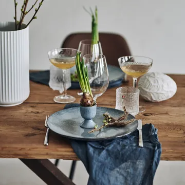 Tallerkenene Nordic Sea fra det danske varemerket Broste Copenhagen passer perfekt når du vil skape en rustikk og levende borddekking. Nordic Sea er en av Broste Copenhagens mest kjente serviser og ettersom hele serien er håndlaget får hver del sitt unike uttrykk og utseende. Serien er produsert i stentøy som deretter har blitt glasert og brent under jorden. Den herlige blågrå nyansen er inspirert av en stormfull dag på de nordiske havene og ettersom fargen er følsom under brenning varierer nyansen fra tallerken til tallerken.