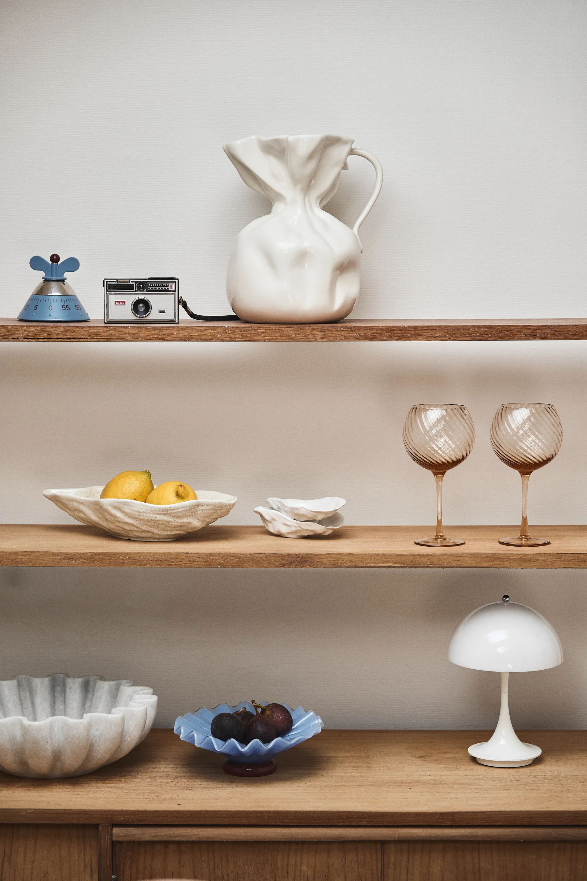 Lori skål M Ø 18 cm fra ByOn er laget i munnblåst glass og har en unik form inspirert av plissert skjørt og blomster som er i ferd med å slå ut. Den glaserte fargen og den runde, lave foten skaper en minneverdig kontrast. Skålen kan brukes til telys, smykker, nøtter eller bare som en dekorativ detalj. Hver skål er håndlaget og unik.