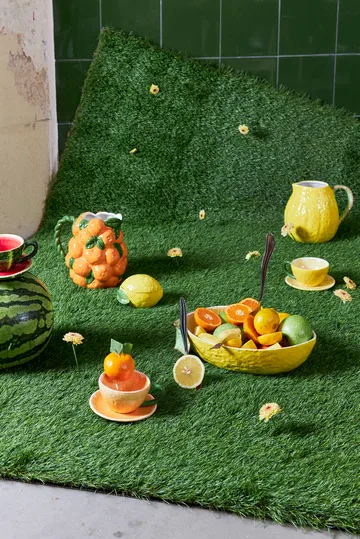 Mandarie kanne 2,5 liter fra svenske Byon er en håndlaget kanne med lekent design som forestiller å være dekket av mandariner. Det tvinnede håndtaket blir en morsom tvist, og kannen vil i det hele tatt få betrakteren til å smile når han heller opp morgenjuicen.