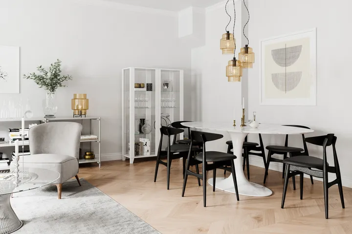 Ebbot 3 lys pendel fra By Rydéns er en iøynefallende taklampe som gir tydelig tilstedeværelse i rommet med sine tre hengende skjermer. Formgitt for å gi effektiv og innbydende belysning krever den bare ett takuttak samtidig som hver ledning kan justeres for ulike høyder — perfekt over spisebordet eller i sofasonen. De glasserte skjermene og den samlede takkoppens eleganse skaper et enhetlig uttrykk som løfter innredningen og gir både funksjon og karakter i hjemmet.