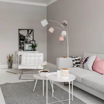 Foggy gulvlampe fra By Rydéns er 2 m høy og designet med en svart base. Lampen har fem armer i varierende lengder, hver kronet med lampeskjermer i grå, svarte og hvite toner. Den utgjør et dekorativt innslag ved siden av sofaen eller din favorittlenestol, noe som gjør rommet mer innbydende og dynamisk.