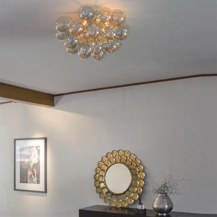 Den populære lampen Gross fra By Rydéns, her som plafond, er en moderne og dekorativ lampe som består av vakre glasskuler festet i en klynge. Gross finnes i flere farger og takket være den litt lavere modellen kan den henges i de aller fleste rom uten at den tar for stor plass. En lampe perfekt for det moderne hjemmet!