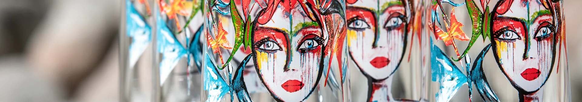 De fargerike motivene på glass og porselensprodukter forestiller kvinnelige portrett. Inspirasjonen til motivene kommer fra kvinner som Carolina Gynning har møtt i livet, og som hun føler at hun har fått både inspirasjon og glede av.