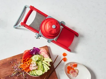 De Buyer Swing Plus mandolin fra de Buyer har en rustfri rampe med en glatt overflate som gjør at maten glir lett når den skal skives. Bladet har gripeoverflate for sikker håndtering, og bena til mandolinen har sklisikre føtter. Du kan selv velge størrelse mellom 0,5 og 10 mm for å kunne skive både bølgete, riflete eller glatte potetskiver til helgens potetgrateng.