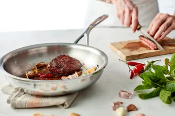 Demeyere Proline stekepanne fra Demeyere er en profesjonell stekepanne som forener presisjon og holdbarhet for hjemmekjøkkenet. Med 7-lagskonstruksjon kant til kant og 7-PlyMaterial® får du en jevn varmefordeling og opptil 50% mer stekeflate — perfekt for saftige brunninger og jevn stekegrad. TRIPLINDUC®-bunn gjør pannen spesielt effektiv på induksjon, mens Silvinox®-behandling letter rengjøring og gir et friskt ytre. Helstøpte ergonomiske håndtak gir trygg gripefølelse. En robust investering for den som vil lage mat med kontroll og resultat — 30 års garanti er inkludert.