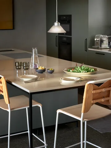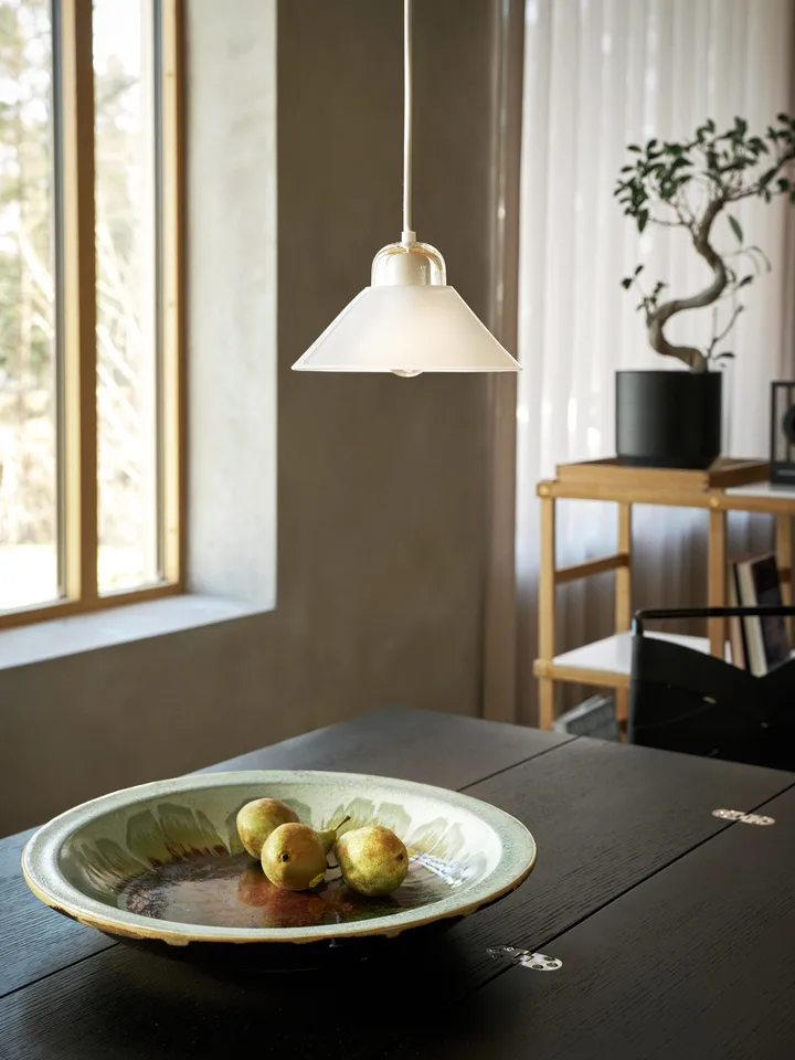 Kalo pendel fra Design House Stockholm, designet av Axel Bjurström, er en elegant tolkning av den klassiske skomakerlampeformen. Produsert i frostet og malt glass, tilbyr denne lampen et mykt, nedadrettet lys som skaper et spill av lys og skygger. Lampeskjermen kan enkelt skyves ut horisontalt for rengjøring eller bytte av lyskilde. Kalo pendel er perfekt både til arbeid og fritid, og gir en varm og innbydende atmosfære enten den brukes alene eller i gruppe.