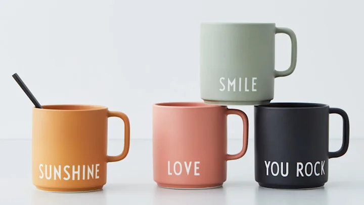 Bokstavene som preger Design Letters’ produkter er Arne Jacobsens klassiske typografi fra 1937. Typografien var opprinnelig designet for å brukes til Århus Rådhus, men i dag er det Design Letters som eier rettighetene, og du kan se den på alt fra kopper og skåler til tallerkener og sengetøy.