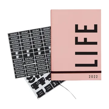 Design Letters veggkalender 2022 har et design med bokstaver og tall fra den danske designeren Arne Jacobsens velkjente font. De 300 klistremerkene som følger med, med ord og bilder, gjør det morsommere og enklere å holde orden på møter, bursdager og andre viktige anledninger. Kalenderen har ordet LIFE skrevet på forsiden, og et smart bånd som gjør at du enkelt kan slå opp riktig uke.