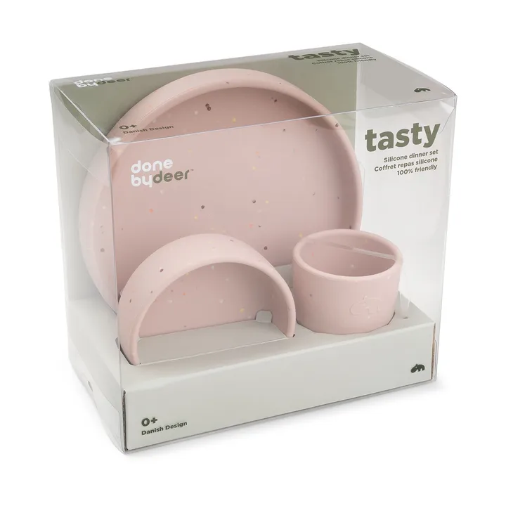 Confetti barneservise 3 deler fra Done by Deer er laget av 100% silikon. Dette sjarmerende serviset med konfettimønster inneholder en tallerken, en skål og en mini-kopp, perfekt for små barn. Silikonet er mykt, slitesterkt og varmebestandig, noe som gjør det trygt å bruke i mikrobølgeovn, ovn, fryser og oppvaskmaskin.