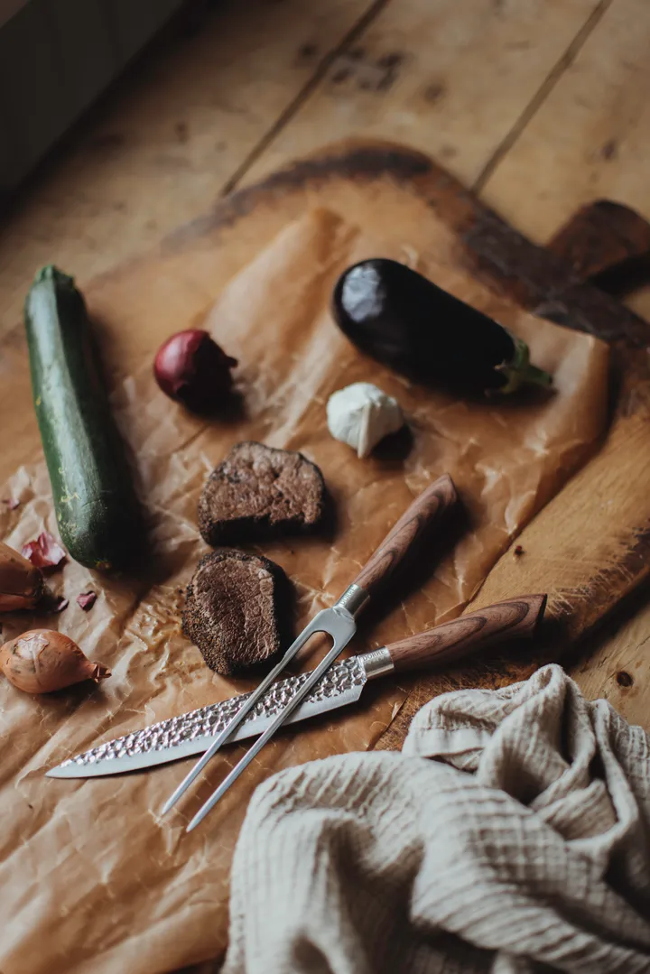 Akira skjæresett 2 deler gir deg presisjon og stil i hvert snitt. Håndtakene i lekker treimitasjon gir et utmerket grep, mens de hamrede stålbladene løfter matlagingen din. Perfekt for å lage vakre kjøttstykker med en følelse av luksus ved bordet. Et uunnværlig verktøy for lidenskapelige kokker.