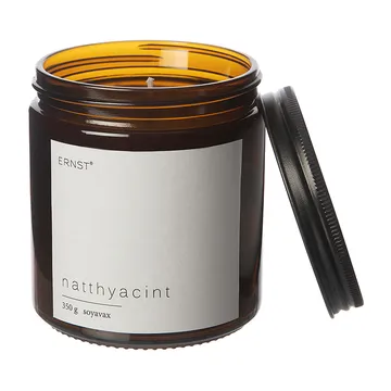 Ernst duftlys i glass med lokk Ø 7,2 cm har en nydelig, myk duft og kommer i en minimalistisk brun glassbeholder med hvit etikett og sort metallokk. Selve duftlyset er laget av soyavoks som har lang brennetid uten å avgi noen gifter. Sett Ernst duftlys på et nøye utvalgt sted og kjenn hvordan den gode duften sprer seg rundt i hjemmet.