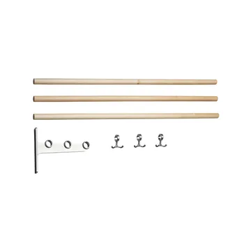 Nostalgi påbyggingsdel sko- eller hattehylle fra Essem Design, designet av Gunnar Bolin, er en tidløs klassiker fra 1937. Hylle kan brukes både som sko- og hattehylle og er laget av resirkulert aluminium og rundstav i tre eller aluminium. Den leveres med kroker og kan bygges ut for å passe dine behov. Maks ti kleshengere anbefales per meter hattehylle. Tilpass etter dine ønsker ved å kappe rundstavene til valgfri lengde.