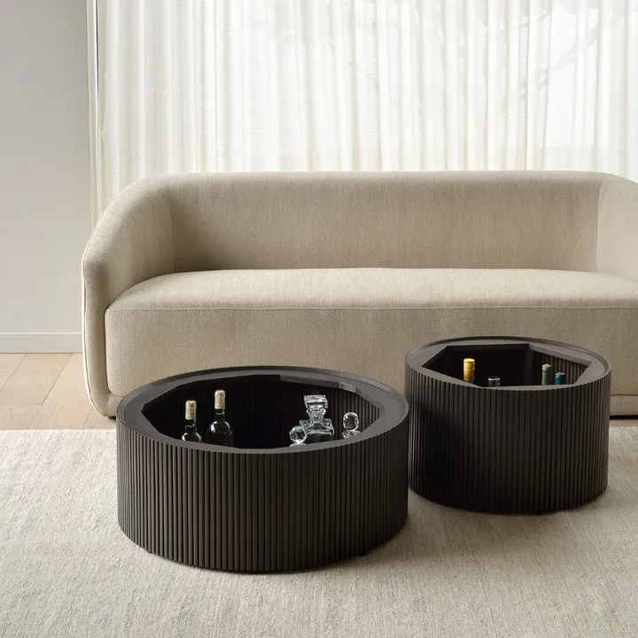 Mahogany Roller Max salongbord fra Ethnicraft er et genialt og allsidig møbel skapt av Jacques Deneef. Bordet har en avtagbar plate som avslører et oppbevaringsrom, perfekt for magasiner, leker eller puter. Denne designen gir en praktisk løsning for hjem med begrenset plass hvor hver kvadratmeter teller.