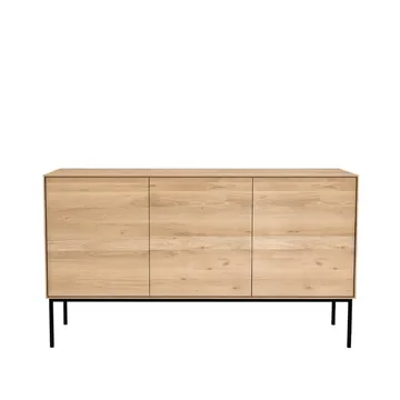 Whitebord sidebord fra Ethnicraft er et elegant møbel som forener kontrasterende elementer gjennom sine myke, runde ben og grafiske rette linjer. Designen tilbyr både praktisk oppbevaring og en visuell balanse i rommet, samtidig som den står som en tidløs del av innredningen.