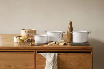 Eva Trio White Line Slip-Let keramisk gryte fra Eva Solo er laget av 98% resirkulert rustfritt stål. Denne gryten er perfekt for store matlagingsprosjekter som supper, gryteretter og hele kyllinger. Med sitt keramiske Slip-Let® belegg forhindrer den at maten setter seg fast og brenner seg, noe som gjør både matlaging og rengjøring enklere. Designet av Ole Palsby fra 1977 sikrer kompatibilitet med Eva Trio-lokk.