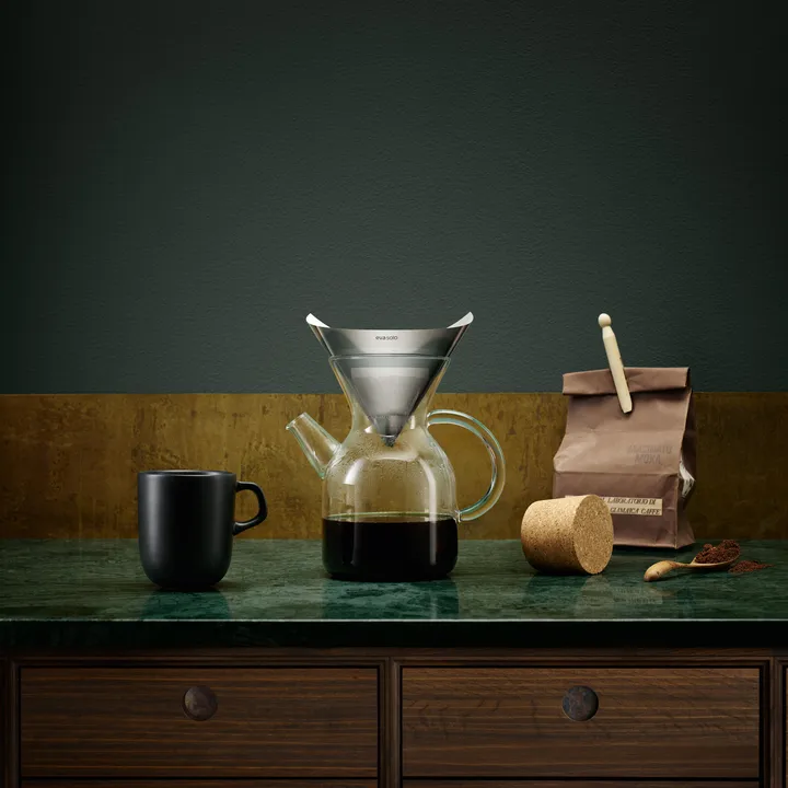 Pour Over kaffebrygger fra Eva Soloer laget av borosilikatglass, og kommer med en tilhørende kork og et filter i rustfritt stål. Med dette slipper du å bruke papirfilter, og kaffens aroma bevares.