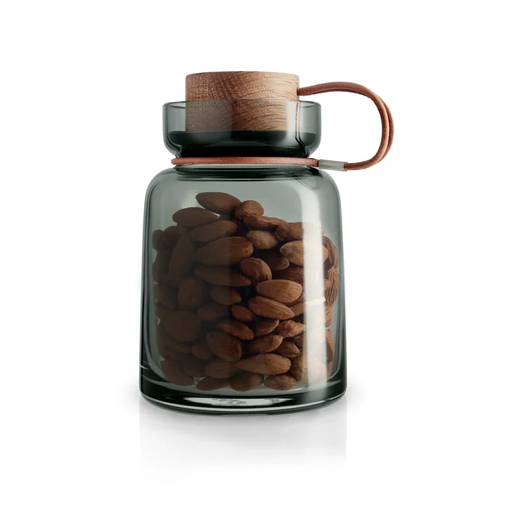 Silhouette oppbevaringsboks smokey grey fra Eva Solo er en munnblåst glassboks med et tettlukkende lokk i eik. Eikelokkets silikonpakning hindrer fukt i å ødelegge innholdet og gjør at lokket sitter sikkert på plass. Lærreimen er både dekorativ og praktisk da den sørger for at du alltid har lokket lett tilgjengelig. Det røykfargede glasset i fargen ”smokey grey” beskytter innholdet mot sollys og bevarer dermed både smak og farge lenger. Bruk glassboksen til nøtter, müsli, havregryn eller andre tørre varer. Oppbevaringsboksens pene silhuett gjør at den mer enn gjerne kan stå fremme på kjøkkenbenken.
