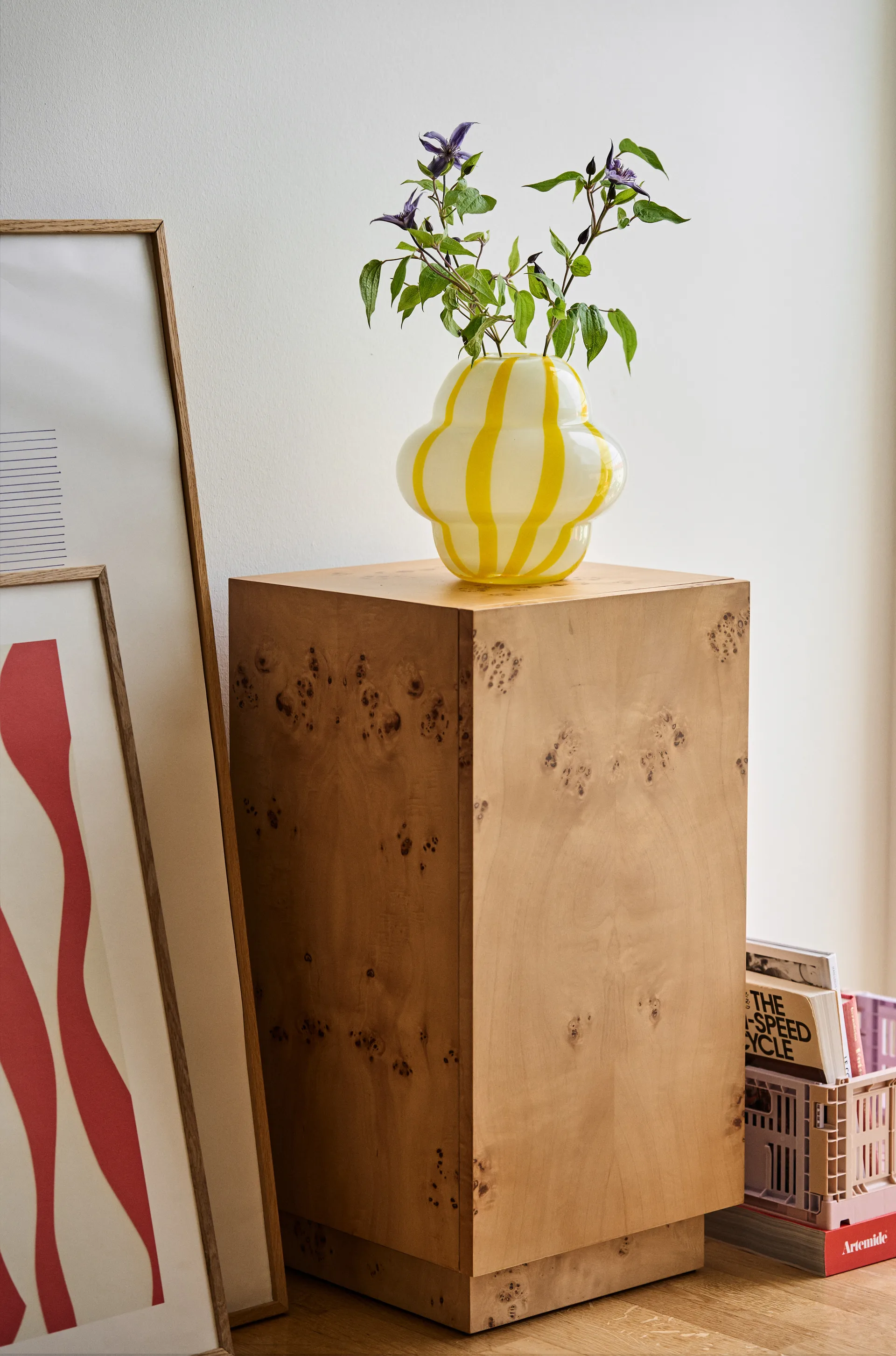 Burl Side Table pidestall fra Ferm Living er laget av vakkert mønstret, FSC™-sertifisert masurbjørk. Bordet er allsidig og kan brukes både som nattbord og sidebord. Den søylelignende designen og skjult oppbevaringsrom med justerbar hylle forsterker atmosfæren i alle rom.