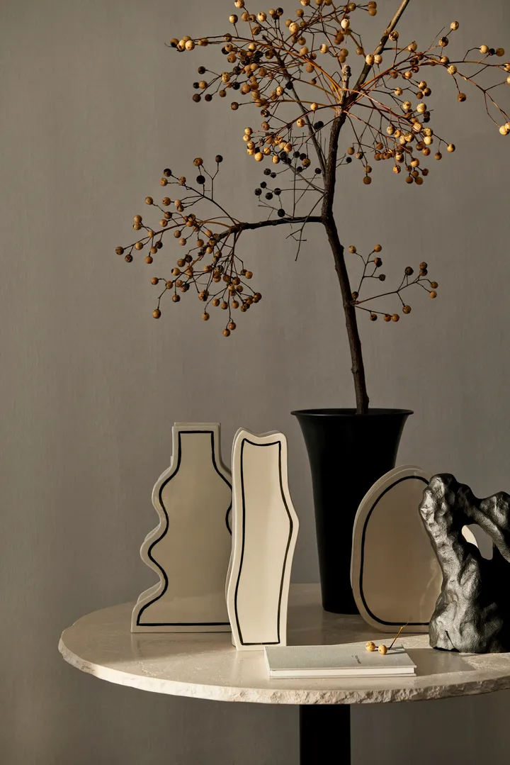 Paste vase rounded 28 cm fra Ferm Living er en leken keramikkvase som leker med 2D- og 3D-silhuetter. To identiske, flate keramiske ark er festet mot en sylindrisk kjerne og skaper en overraskende kopier-og-lim-effekt. De håndmalte, offset-svarte konturene gir hver vase et unikt uttrykk. Plasser Paste vase med dine favorittblomster på vinduskarmen, spisebordet eller hyllen for et kunstnerisk preg i hjemmet — en vakker detalj som også blir et samtaleemne.
