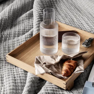 Ripple small karaffel sett fra Ferm Living er et vakkert og gjennomtenkt sett med en liten karaffel og et matchende glass som også fungerer som lokk. Formgivningen i munnblåst glass fra kolleksjonen Ripple gir en myk, rytmisk overflate som fanger lyset og løfter bordet både til hverdagsmåltider og fest. Karaffelen rommer 0,5 liter og glasset 20 cl — perfekt for vann, saft eller en kald drikke ved dekket bord. En fin detalj å ha fremme på bordet eller i kjøkkenhyllen.