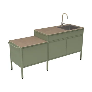 Goosto The Gourmet utekjøkken med vask fra Fermob er et kompakt og praktisk utekjøkken som samler alle funksjoner på kun 190 cm. Den elegante aluminiumskonstruksjonen tåler vær og vind året rundt og gir et rent, moderne uttrykk uten synlige fester. Med robust HPL-benkeplate, rustfri vask og smarte oppbevaringsløsninger får du alt fra arbeidsflate og skuffer til redskapsholder på ett og samme sted. Justerbare ben gjør det enkelt å tilpasse kjøkkenet til ulike underlag, og muligheten til å koble til både vannledning eller hageslange gir maksimal fleksibilitet. Et stilfullt og funksjonelt utekjøkken som inspirerer til matlaging og samvær utendørs.