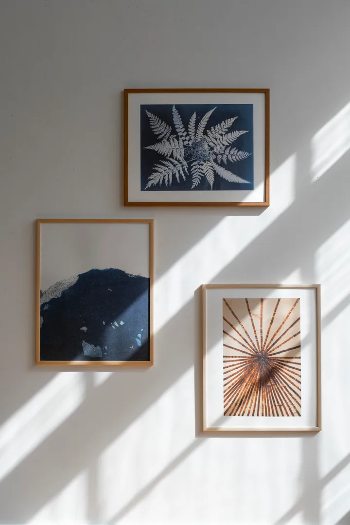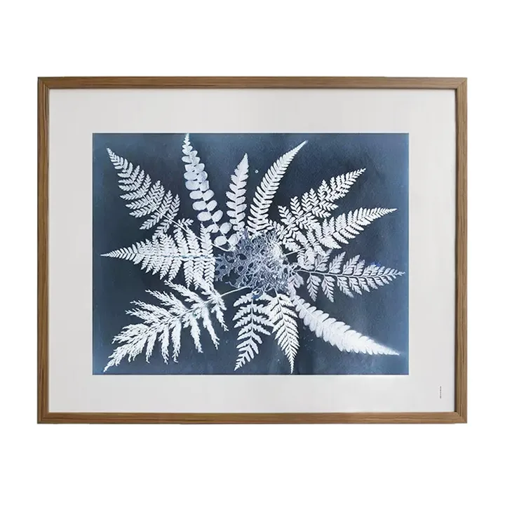 Fern star plakat fra svenske Fine Little Day har motiv av hvite blader mot en blå bakgrunn, designet av Elisabeth Dunker. Kombiner Fern star-plakaten med andre postere eller plakater på en bildevegg eller la den pryde veggen din alene.